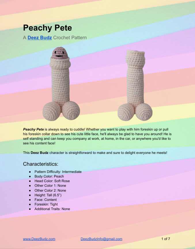 This listing is for the complete Peachy Pete crochet pattern. There is no physical item associated with this listing. But what you DO get is all the instructions you need to make your very own Peachy Pete pal! This 7 page PDF includes everything you need to know make this adorable Deez Budz companion! Including materials, tools, and step-by-step detailed instructions.